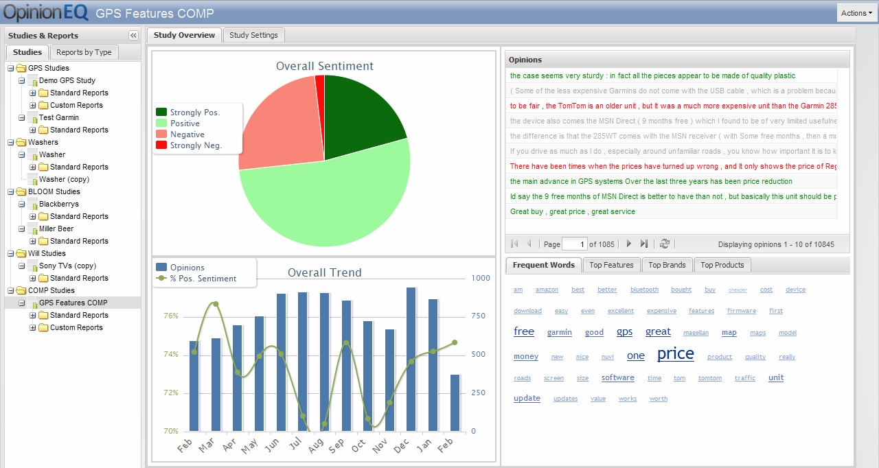 OpinionEQ Decision Dashboard Providing online access to the OpinionEQ SMI Decision Platform, the Dashboard allows users to create studies based on multiple combinations of brands, products, content sites and features. These studies can then be run in real time and the results can be analyzed through a wide range of highly customizable reports. The Dashboard also provides addtional data and reporting features, such as top idenitifed products and feature, word frequencies, and direct access to the data used to complete the study, with drill-down all the way to the source page of the content.